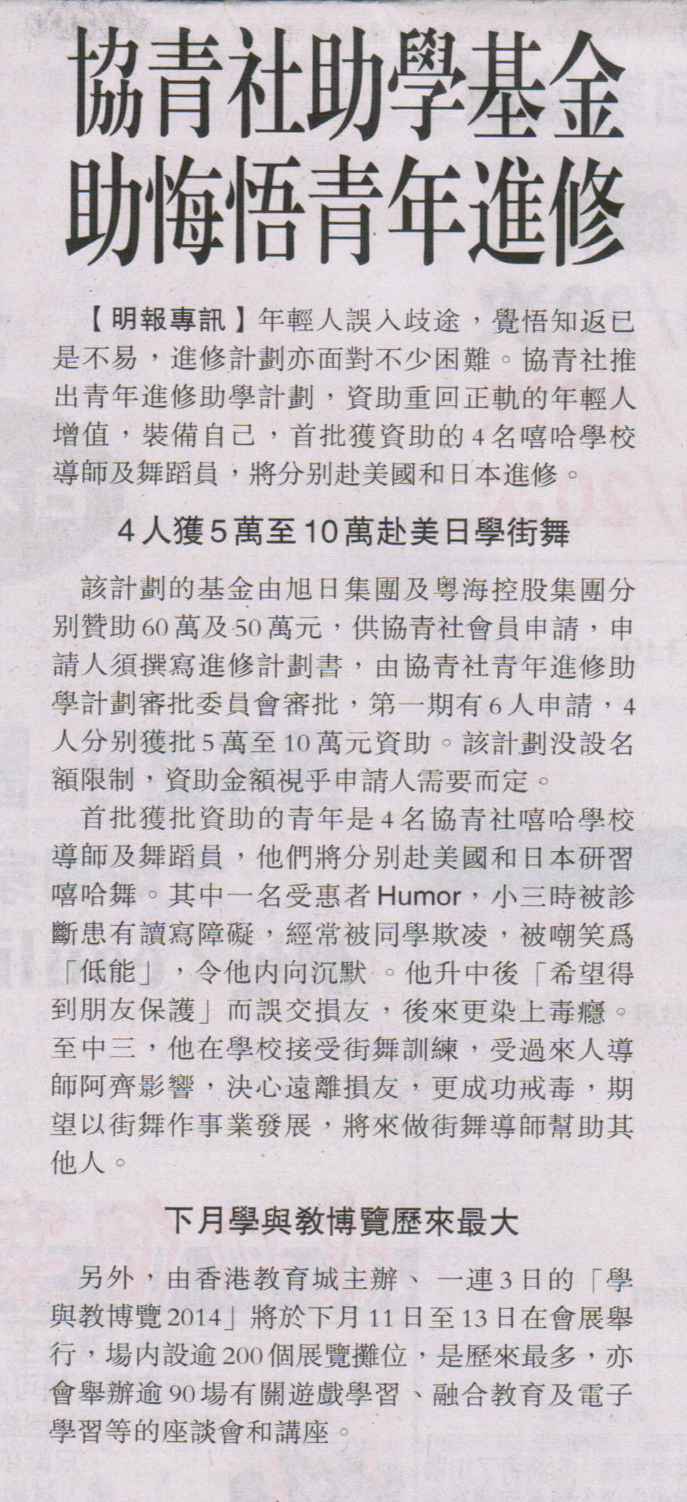 | 5-4-2014 | 「三低青年」學街舞翻身 | 《明報》 Ming Pao |