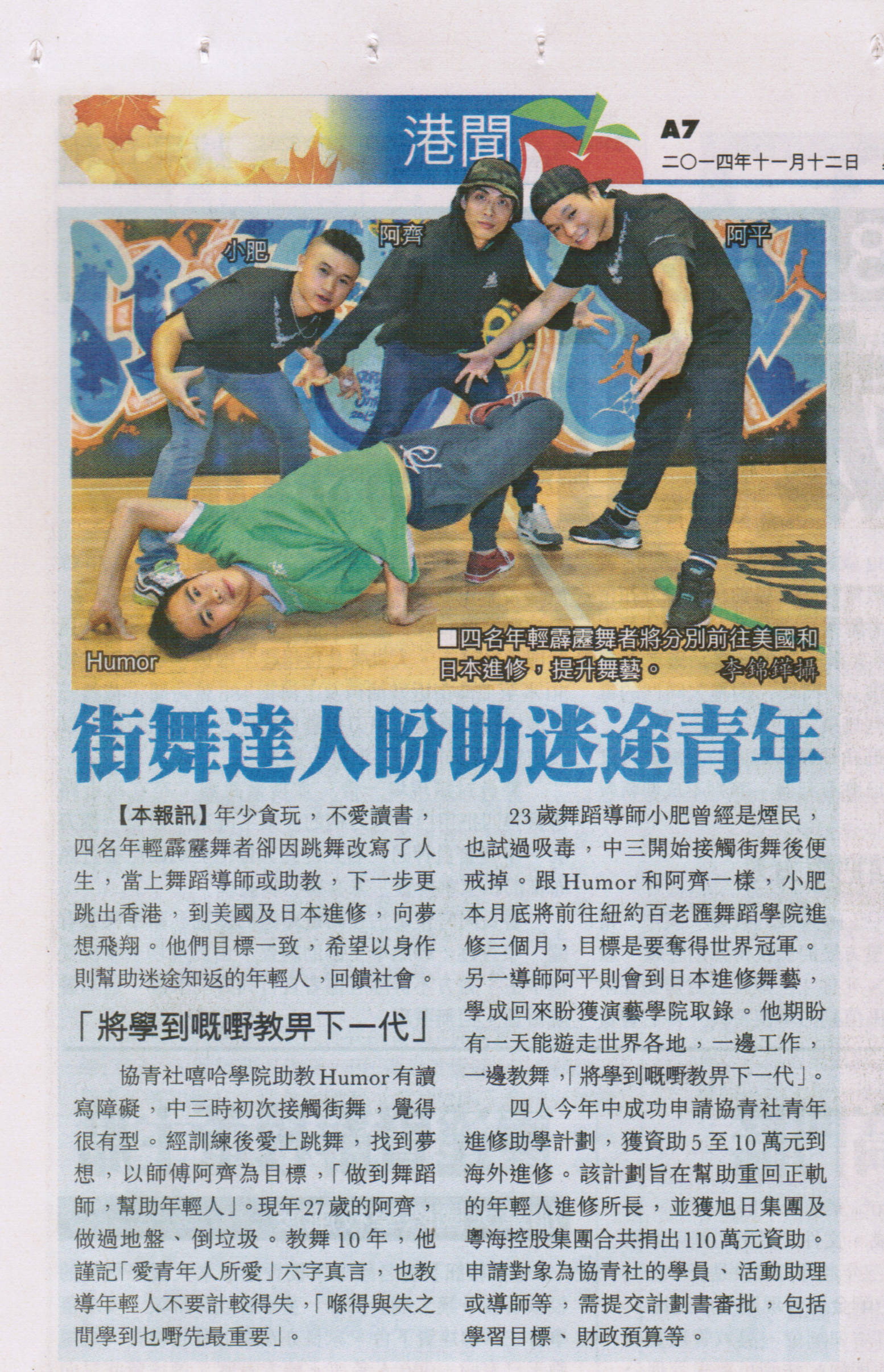 | 12-11-2014 | 街舞達人盼助迷途青年 | 《蘋果日報》 Apple Daily News |