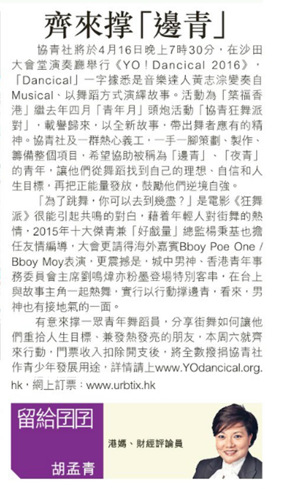 | 21-3-2016 | 協青社辦街舞劇助「邊青」 | 《星島日報》 Sing Tao Daily News |
