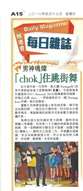 | 17-4-2016 | 男神鳴煒「chok」住跳街舞 | 《星島日報》 Sing Tao Daily News |