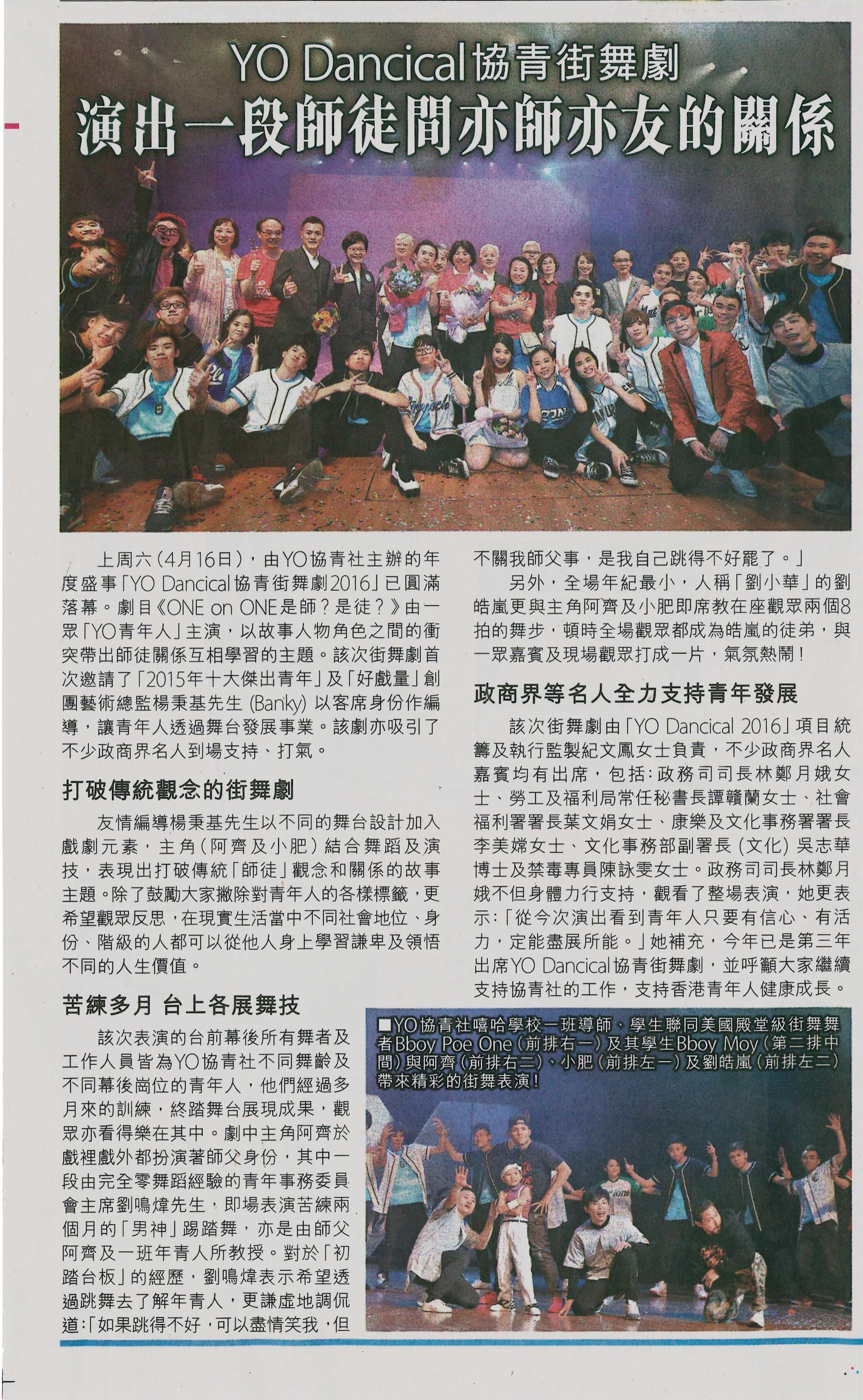 | 22-4-2016 | YO Dancical協青街舞劇 激發青年人潛能 | 《香港商報》 HK Commercial Daily |